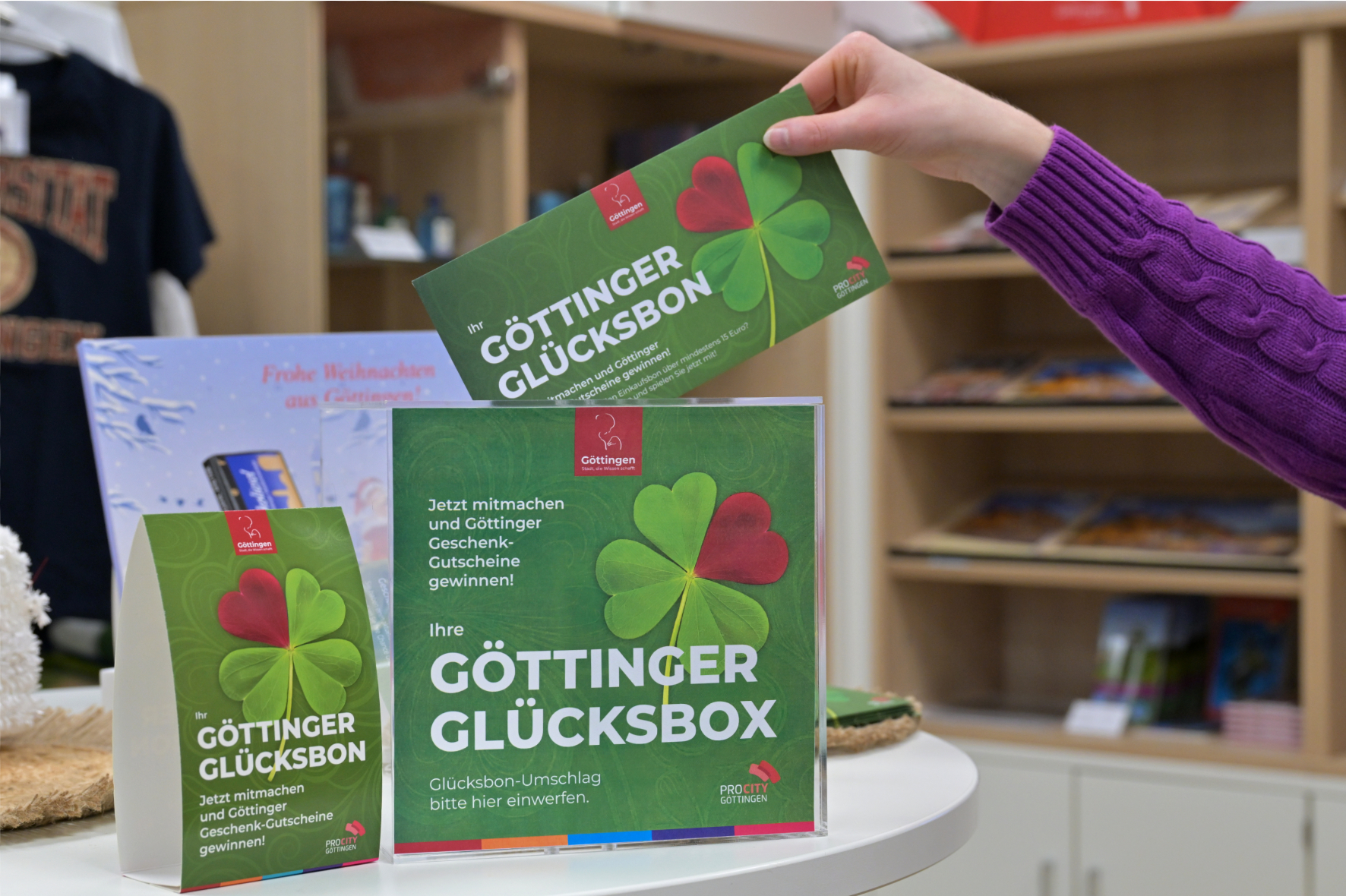 Das Mitmachen ist einfach. Wer im Aktionszeitraum 1.11. bis 14.12.2025 in einem Göttinger Geschäft einkauft, kann seine Einkaufsquittung ab mindestens 15 Euro als Glücklos einsetzen. Der Einkaufsbon wird in einen Glücksbon-Umschlag gesteckt, der mit dem Namen und der Adresse des/der Teilnehmenden versehen wird. Der Glücksbon-Umschlag kann in die Glücksboxen in den folgenden Göttinger Geschäften eingeworfen werden:
